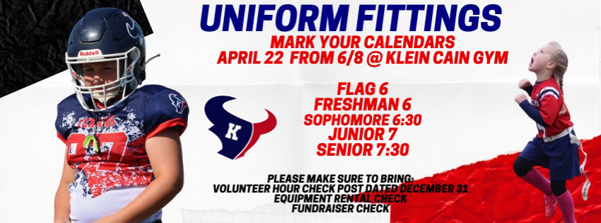 DESCRIPTION:Banner Photos will be taken on Friday, 8/12 at Klein cain High School.  Please come completely dressed at your assigned time slot.  \NCherubs & Angels - 4:20pm - 4:40pm\NFlag Football  & Seniors -  5:00pm - 5:30pm\NJuniors  -  5:20pm - 6:00pm\NSophomores  -  5:50pm - 6:30pm\NFreshman  -  6:20pm - 7:00pm\N
